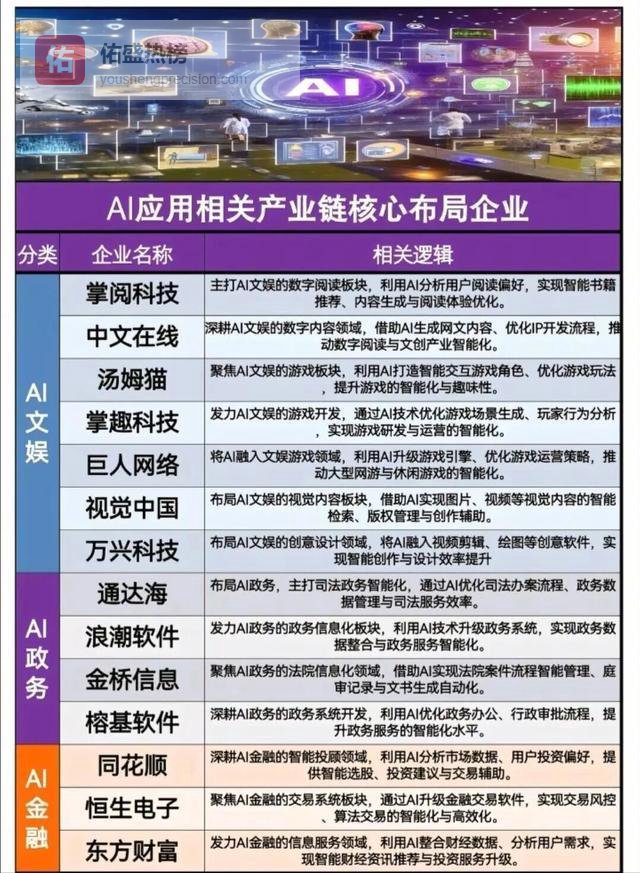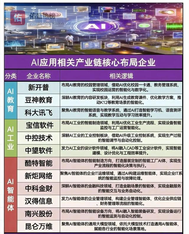 AI办公:金山办公、用友网络等,把AI装进你的文档、表格和ERP系统里。AI医疗与教育:科大讯飞、创业慧康等,用AI辅助诊断、个性化学习。AI工业与金融:中控技术、恒生电子等,在工厂和交易系统中扮演“智能大脑”。