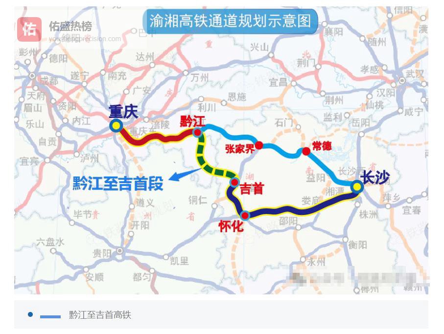 黔吉高铁从重庆黔江延伸到湖南吉首。投资454亿元,设计时速350公里。这条线路是成渝地区南下大湾区的捷径,战略意义重要。武陵山区旅游资源丰富,高铁将带来客流增长。