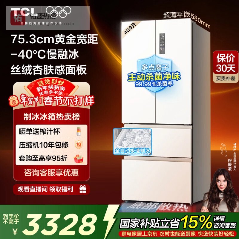 TCL冷布丁409L法式多门冰箱超窄超薄小户型零嵌全自动制冰慢融冰冰箱一级能效R409T7-DQB国家补贴¥