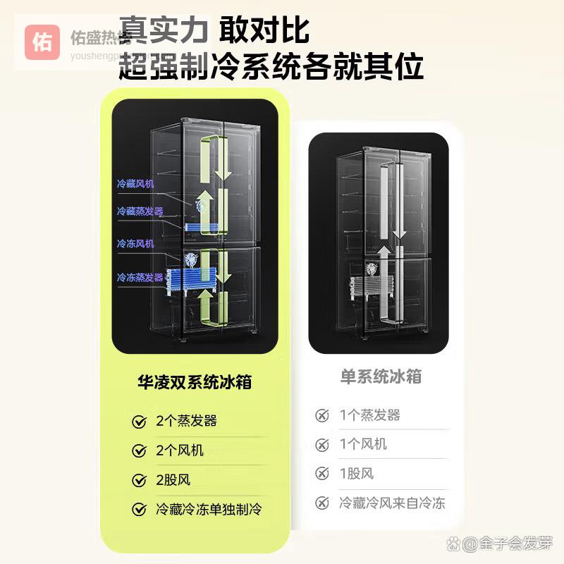 ④ 华凌双系统547L十字对开门冰箱华凌这款冰箱最硬核的亮点是双系统独立制冷:冷藏和冷冻各配一套蒸发器+风机,彻底杜绝串味,榴莲和牛奶放同一层也不打架,蒜苗和车厘子共处一室照样新鲜如初。不像单系统冰箱靠风道来回吹,它俩是真正“各管各的”。