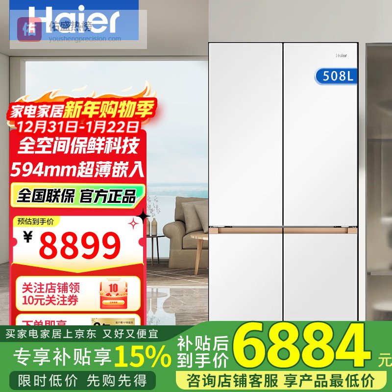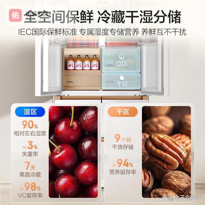 ⑤ 海尔508L全空间保鲜冰箱海尔这款冰箱玩的是湿区干区物理隔离保鲜:湿区湿度常年维持在90%以上,绿叶菜放七天根茎还脆;干区则精准控在35%-50%湿度区间,坚果、茶叶、奶粉放进去九个月都不返潮、不哈喇。两个区域之间完全不串气,中间有物理隔板挡着,不是靠算法“假装分开”。