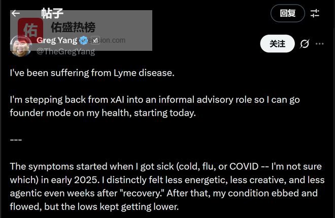 杨格发文称他被诊断出患有莱姆病(Lyme disease),并透露其可能很早就患病了,但是在全力以赴创建xAI、长期透支身体、削弱免疫系统之后,症状才开始显现。