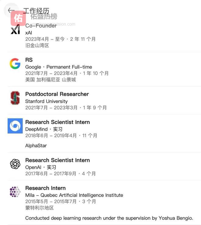 在进行博士后研究的同时,吴宇怀加入了谷歌,在谷歌工作至2023年。而后,他与马斯克等11位创始人,联合创办了xAI。
