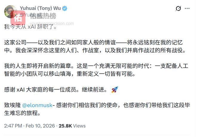 智东西2月10日消息,刚刚,马斯克旗下AI独角兽xAI的联合创始人吴宇怀在X上发文,宣布自己已从xAI离职。