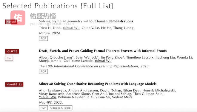 吴宇怀的主要研究方向是打造具备推理能力的机器。在校期间,他主导或深度参与了多个知名项目,如自训练增强推理模型STAR、定理证明器Alpha Geometry以及语言模型Minerva,目标是创造一个自动化的AI“数学家”。