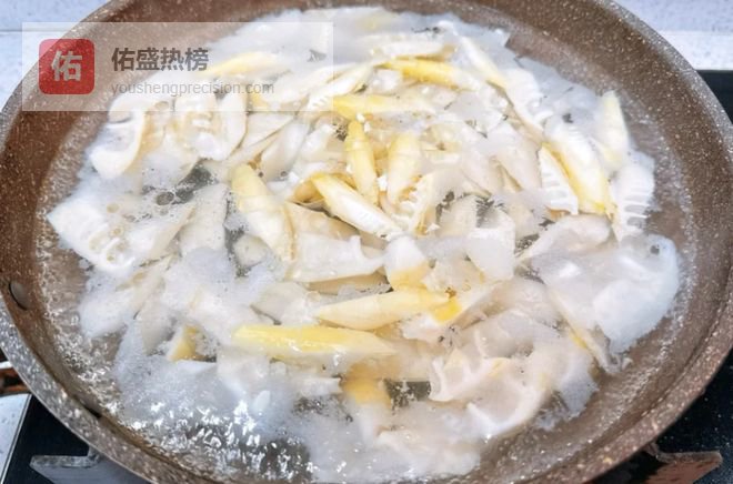 2:春笋想要口感好,提前煮一些清水,水开加上食盐,倒入春笋焯水2分钟,去掉异味,控干水分,这样春笋非常脆口,捞出用凉水冲洗干净,控干水分即可。