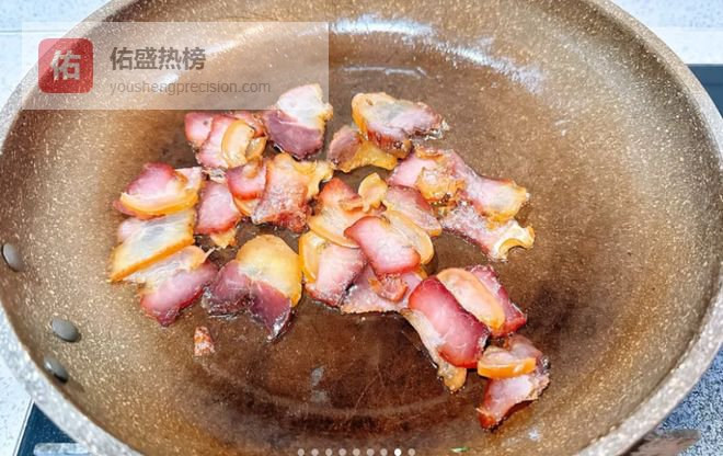 5:腊肉比较硬,刮掉表面的脏东西,用开水煮几分钟,腊肉变软后捞出,用清水冲洗干净,这样能够去掉咸味,然后切成厚度相同的片状,这样受热更加均匀。