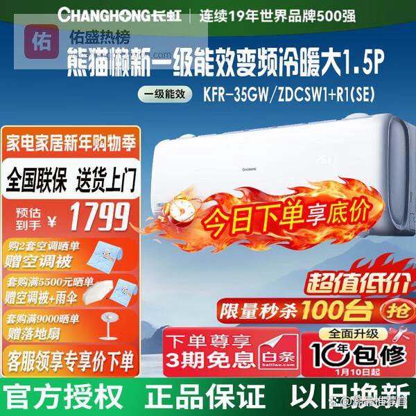 长虹空调 大1.5匹 冷暖空调 新一级能效 变频节能省电卧室家用十年包修KFR-35GW/ZDCSW1 R1(SE) 熊猫懒 1.5匹 一级能效 大1.5匹¥