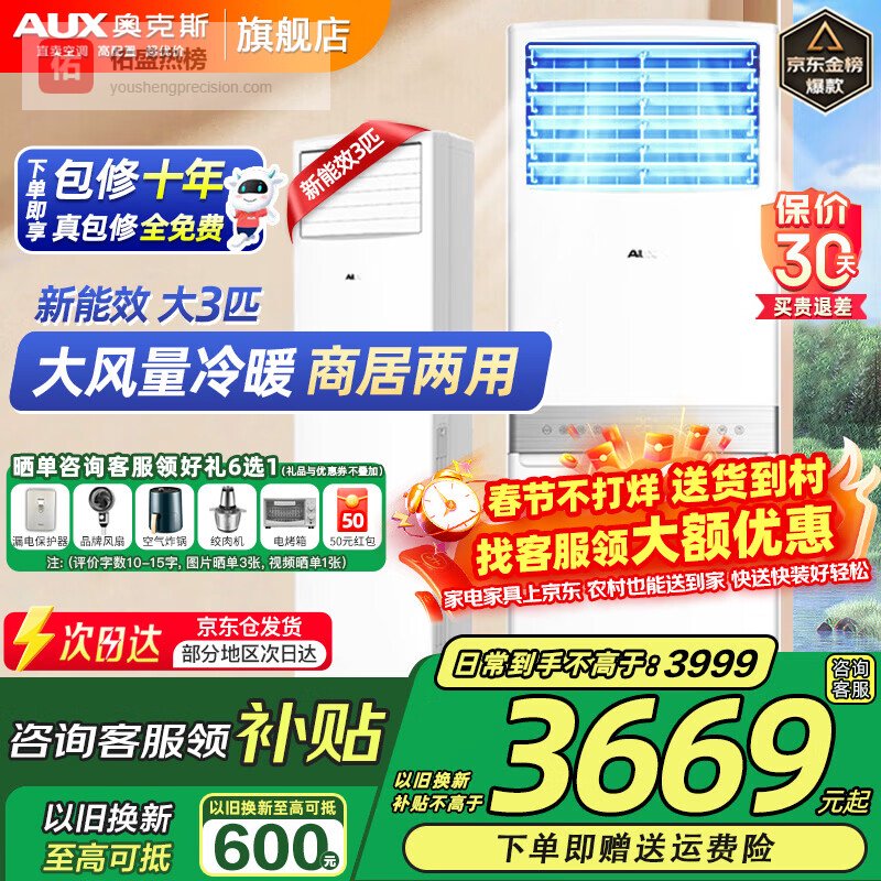 奥克斯(AUX)大3匹新一级三级能效柜机空调立式2P 家电补贴20% 变频冷暖省电 自清洁高温除菌立柜式空调 大3匹 三级能效 【商住两用大风量】32-48平 【强劲冷暖 除菌自清洁】¥