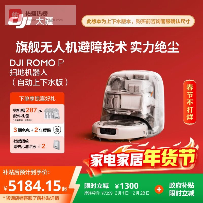 【京东自营】大疆DJIROMOP自动上下水版旗舰透明扫地机器人避障扫拖一体¥