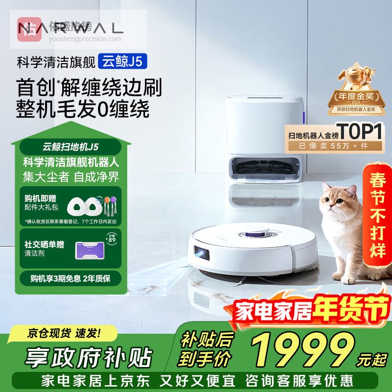 【京东自营】云鲸扫地机器人J5宠物清洁扫拖一体自动清洗全自动拖地家用智能擦地机机械臂外扩毛发0缠绕水¥