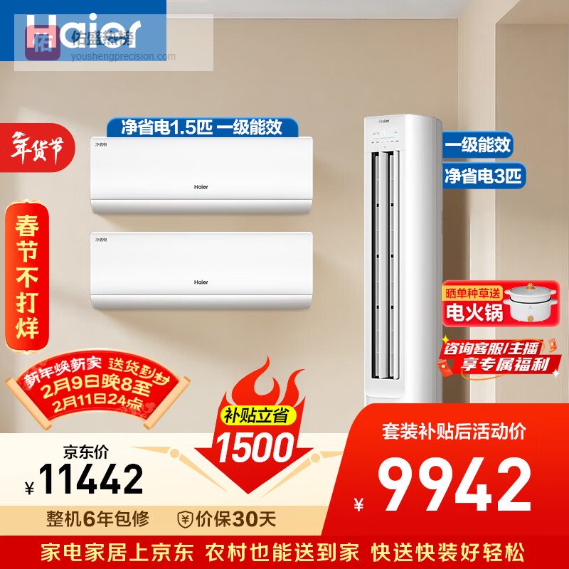 海尔净省电空调套装 小红花套系 AI节能大1.5匹挂机大3匹柜机 新一级变频冷暖空调 两室一厅 以¥