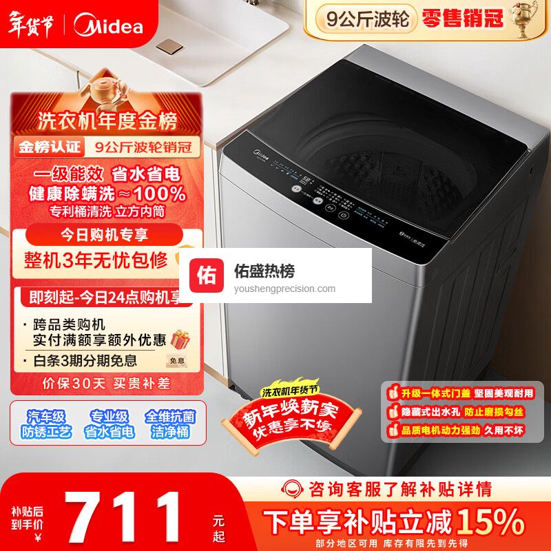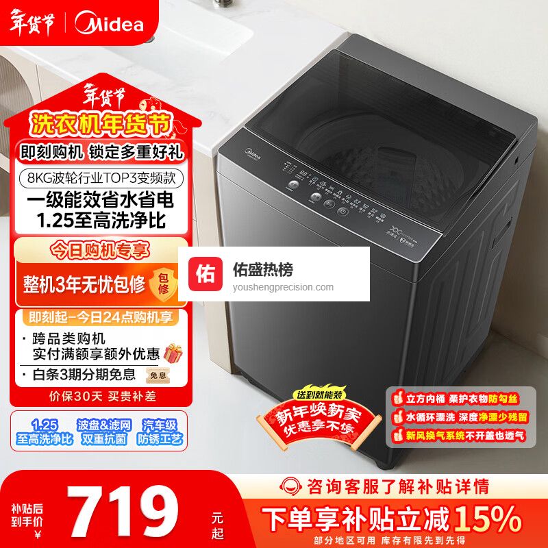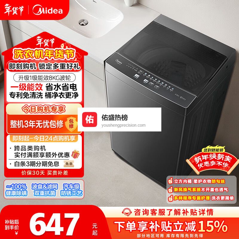 ⑤美的随心洗波轮洗衣机8公斤小户型一级能效别看它是小体积,但1.25高洗净比实实在在提升了去污实力,顽固汗渍、油渍、果汁印都能洗得透亮,不是靠猛转硬甩,而是用科学水流节奏层层剥离污垢,洗完衣服蓬松不板结,质感依旧在线。