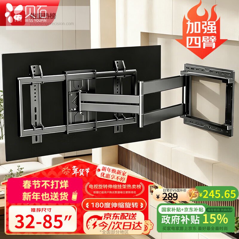 贝石 加厚通用电视机挂架旋转伸缩折叠壁挂墙挂电视挂架支架通用TCL雷鸟海信创维tcl等556575英寸 实心轴丨32-85英寸【75英寸内左右90°旋转】¥
