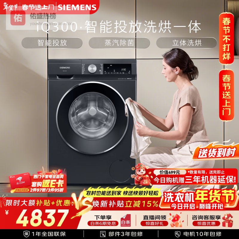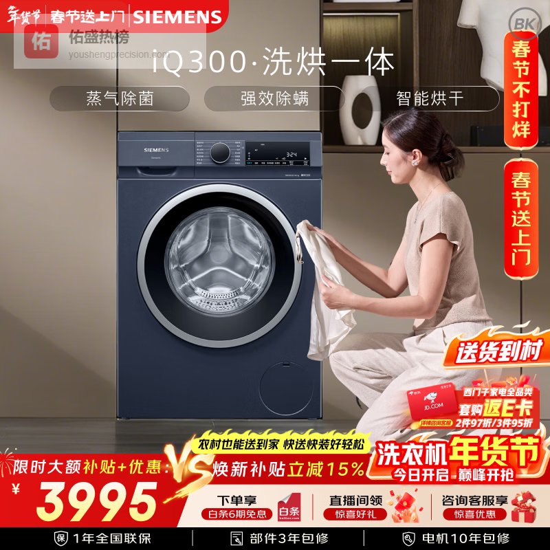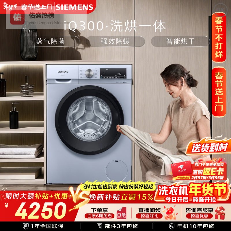 西门子(SIEMENS)iQ300 10KG大容量 全自动滚筒洗衣机自带烘干 洗烘一体 蒸汽除菌 热风清新 WN54A1X42W 国家补贴¥