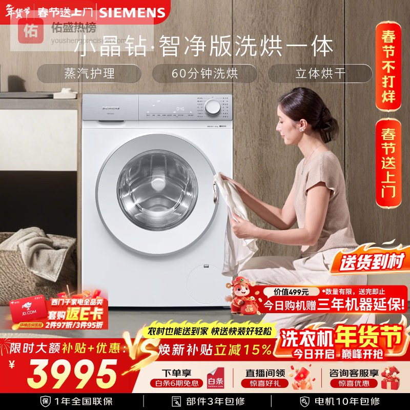 西门子(SIEMENS)小晶钻 10KG大容量全自动滚筒洗衣机自带烘干 洗烘一体 蒸气护理 立体烘干 WN52B2U08W 国家补贴¥