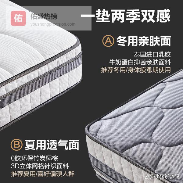 ▶ 双面设计:这款床垫有冬夏两用面,冬季用牛奶蛋白抑菌面料,又柔又暖,还透气舒适;夏天则换成竹炭椰棕面料,排湿又透气。一年四季都能用,一床搞定,不用换,挺方便。