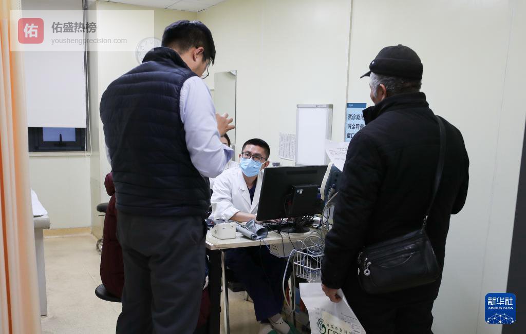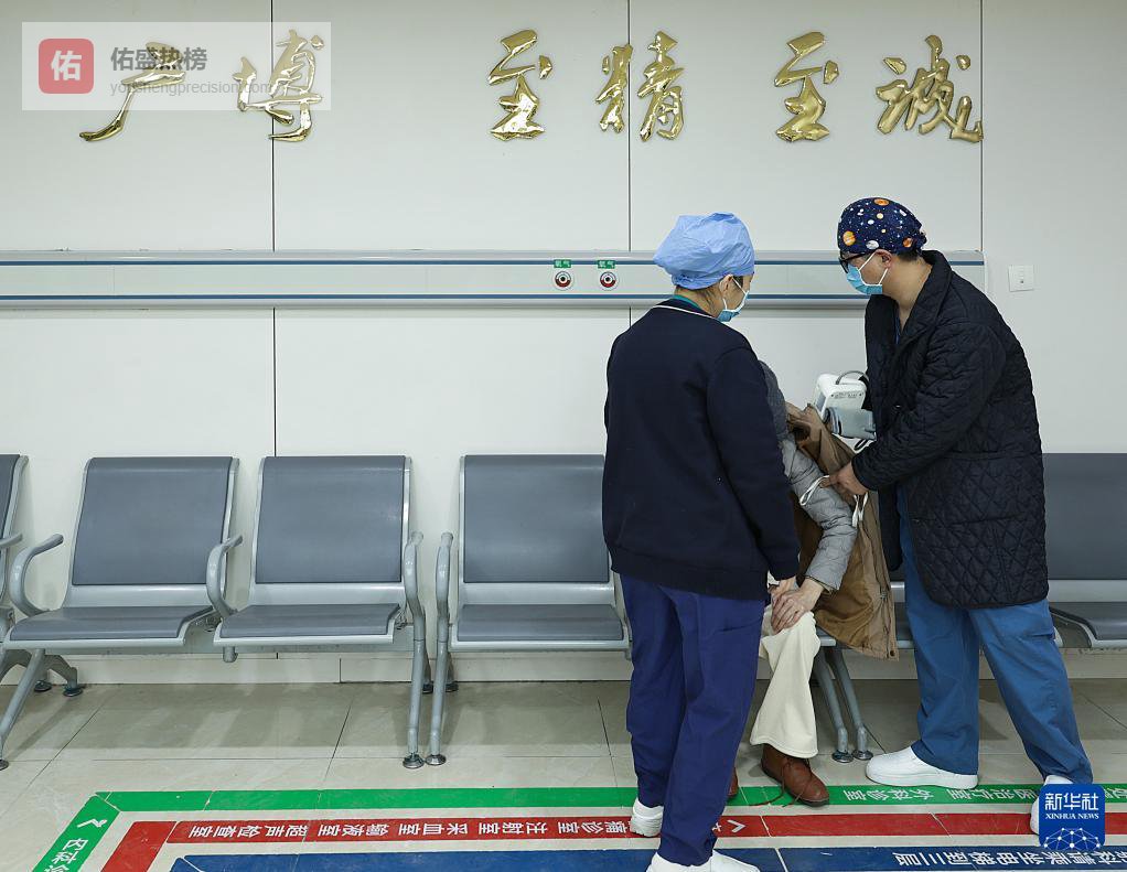 2月5日21时许,两名值班护士在急诊大厅为一名患者测血压。