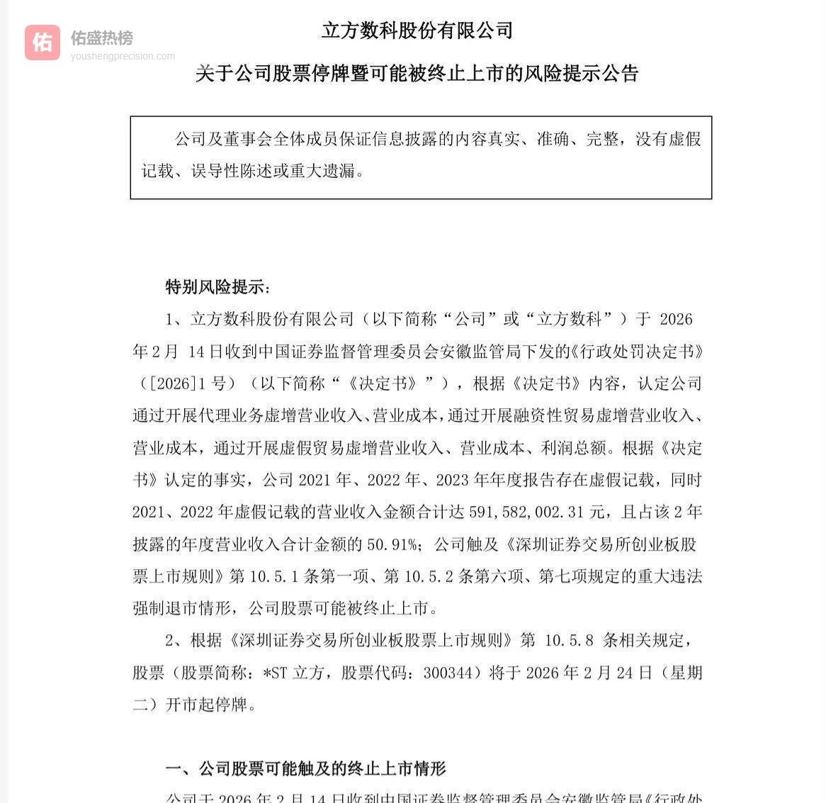 《关于拟终止立方数科股份有限公司股票上市的事先告知书》。