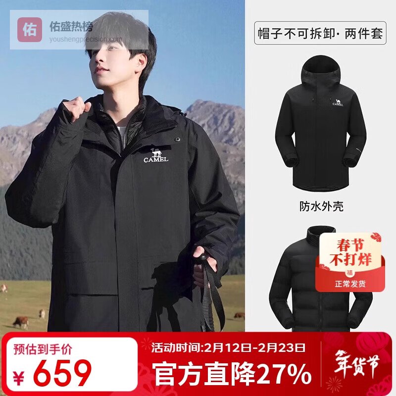 骆驼(CAMEL)三防冲锋衣户外登山服防风防水防污三合一运动外套 AD12263514Y,羽绒内胆幻影黑男女 M¥