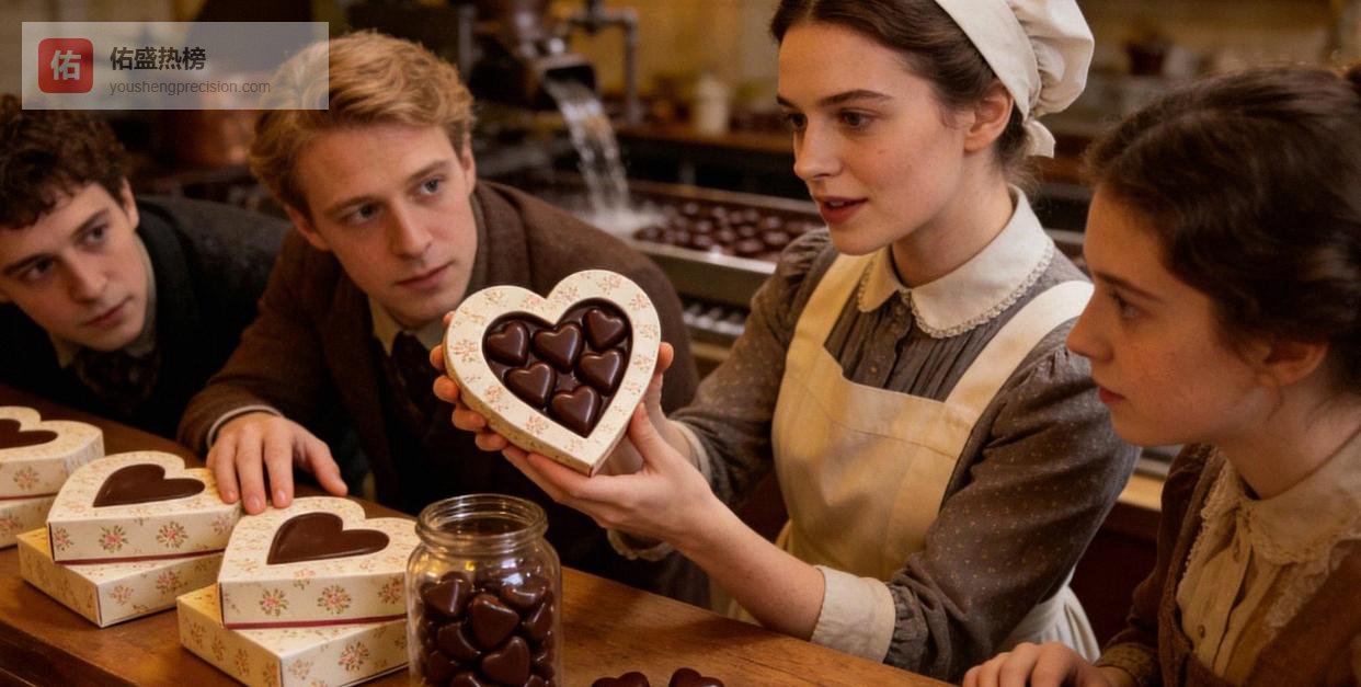 1868年,吉百利把巧克力做成爱心形状,一次爆火,之后“爱=巧克力+玫瑰”的规则就写进了消费法则