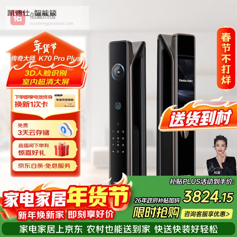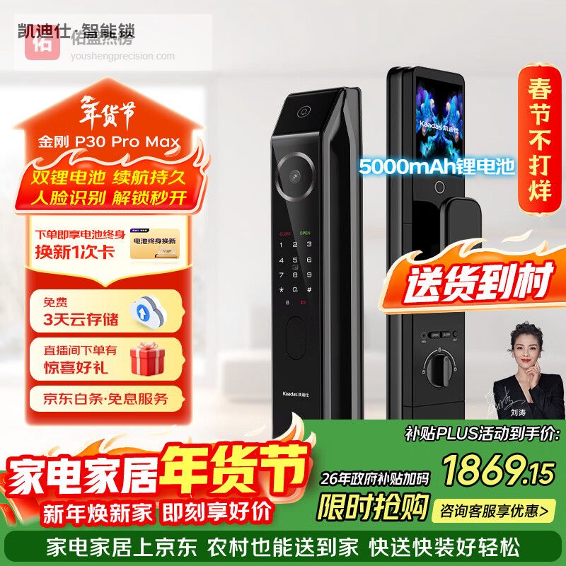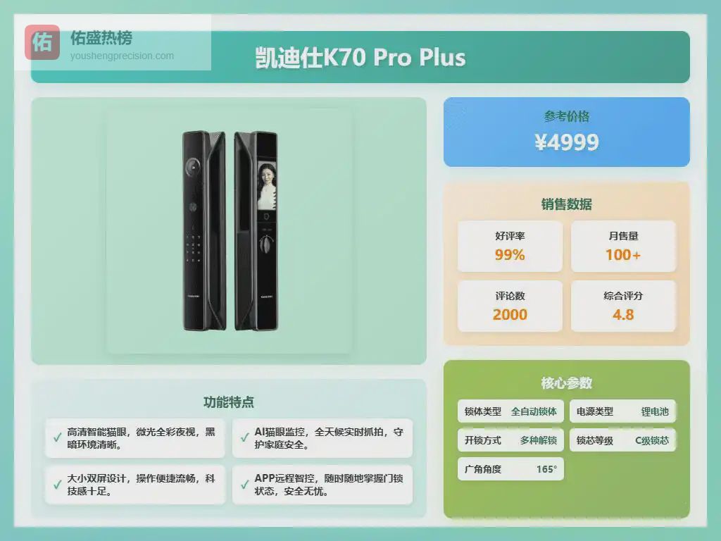 5、凯迪仕金刚P30F Pro这款凯迪仕智能锁P30 Pro Max亮点颇多,人脸识别解锁超方便,解放双手,尤其适合宝妈们!它还支持指纹、密码、门卡等多种开锁方式,总有一种适合你。更棒的是,它的AI哨兵系统可24小时守护,有人在门口逗留还会抓拍提醒,安全感满满。