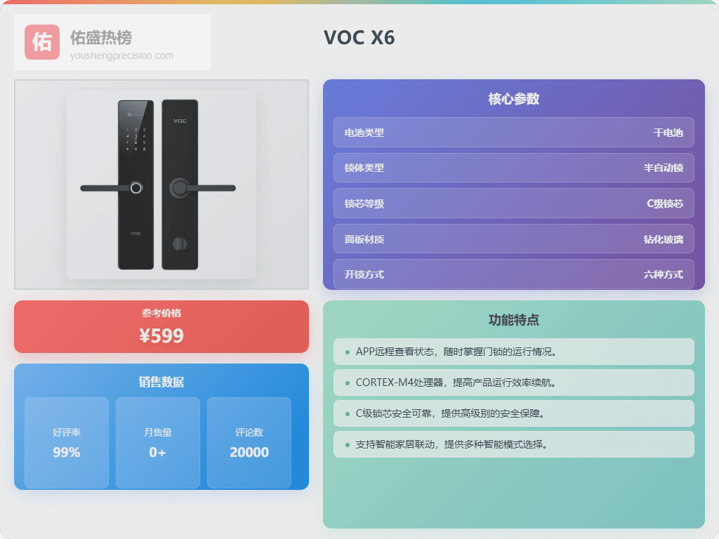 安全性方面,VOC X6也考虑得很周到。C级锁芯,还有室内机械反锁功能,安全系数有保障。它还有防试开、防撬、防劫持报警,安全功能很全面。有个用户说,家里之前用的也是VOC,这次换新发现感应更灵敏了,开门特别顺畅!
