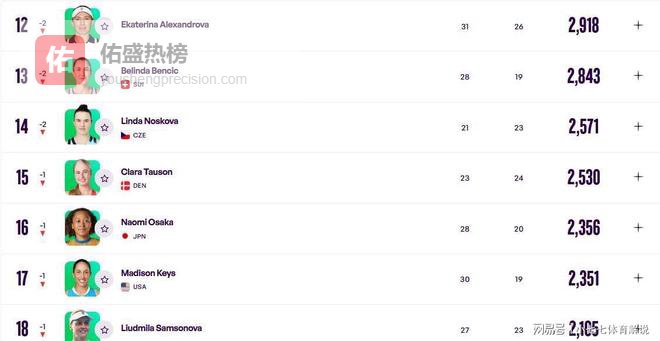 穆霍娃夺冠后、提升8位升至第11位,亚历山德洛娃在好不容易进入到TOP10没多久后、便又跌出了前10,从第12位到第19位的球员,排名全部是出现了变化。