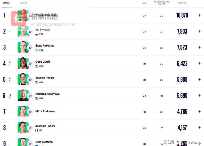 最新的排名方面,TOP10球员方面,前三名没有变化,萨巴伦卡、斯瓦泰克和莱巴金娜仍然是位居前三位,而且可以看出,萨巴伦卡的优势比较明显,斯瓦泰克和莱巴金娜的差距比较小,值得一提的是,萨巴伦卡和斯瓦泰克已经退出了今年第二个1000赛迪拜赛。