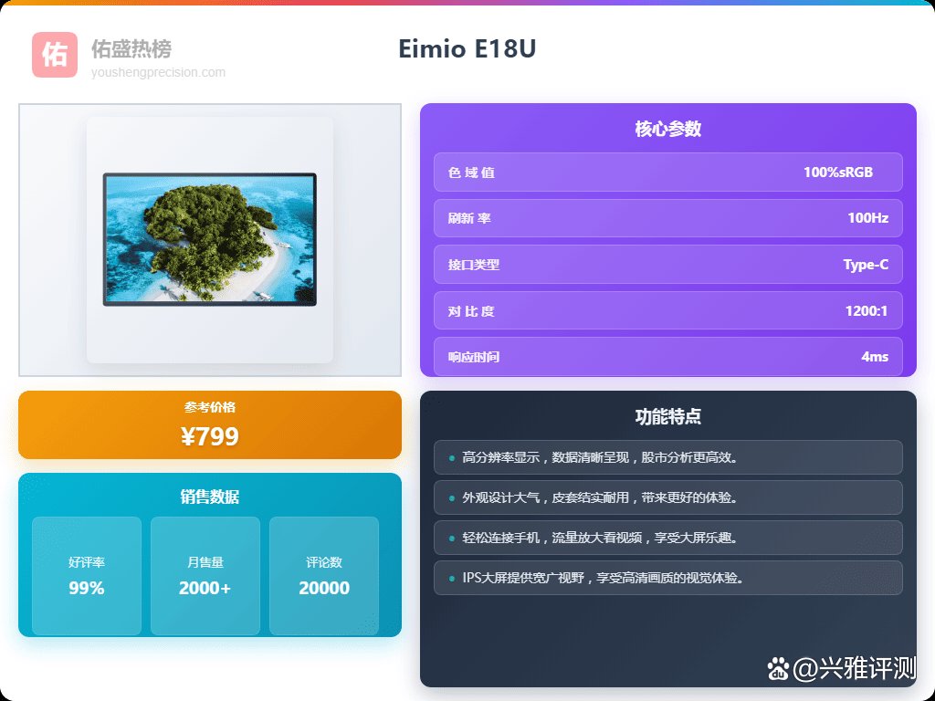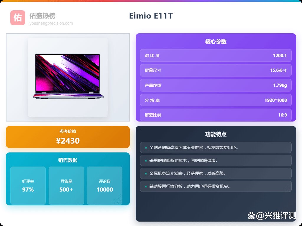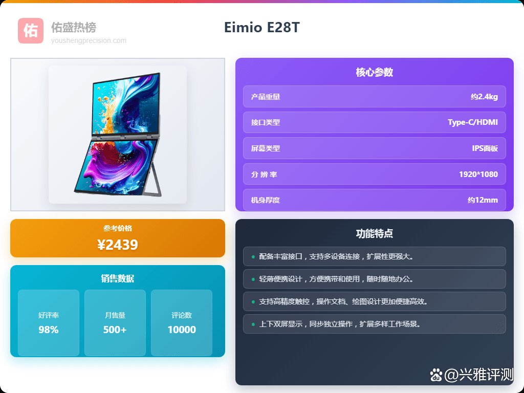 其次,别光盯着参数看,也要考虑一下使用场景和一些附加功能。像经常需要移动办公的朋友,可以看看Eimio E11T,轻薄便携,带着出门也方便。如果你需要多屏协同,Eimio E28T的双屏扩展功能绝对能提升你的工作效率。还有就是接口,Type-C、HDMI这些都要考虑进去,毕竟外接设备啥的,接口不够用就尴尬了。另外,护眼功能也很重要,现在大家用电脑的时间都挺长的,Eimio好几款显示器都带有低蓝光模式,可以有效减少眼睛疲劳,对自己好一点总是没错的。