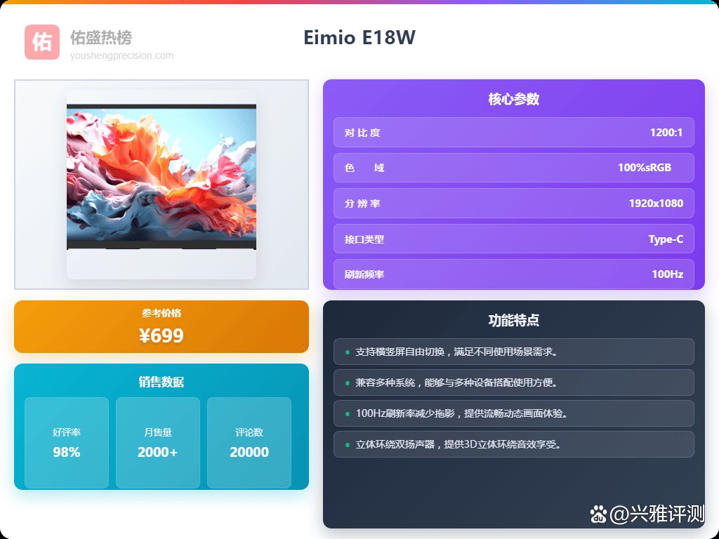 首先啊,得看你主要用显示器来干嘛。如果你是游戏党,那高刷新率绝对是刚需,像Eimio X16HR,240Hz直接拉满,玩游戏那个流畅度,谁用谁知道!还有Eimio E18W,120Hz也够用,价格也更亲民。当然啦,不是所有人都天天打游戏,如果你主要用来办公或者看看电影啥的,那就可以考虑色彩表现好一点的,比如Eimio E215,100%sRGB色域,色彩还原到位,看着就舒服。总而言之,根据自己的主要用途来选,别盲目追求参数,适合自己的才是最好的嘛。