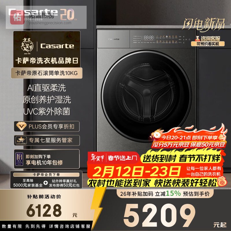 【京东自营】卡萨帝揽光WB滚筒洗烘一体10KG?洗衣机全自动智能投放?家电国家补贴15%CEHB10¥