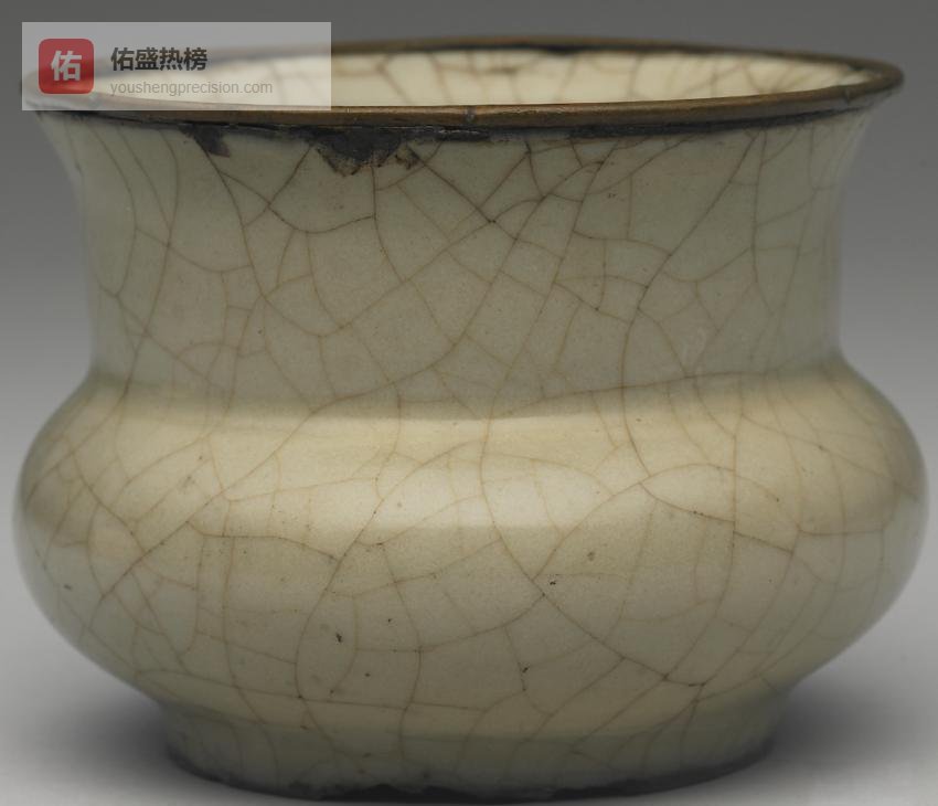 美国哈佛艺术博物馆藏此尊,器型、釉色、开片皆仿宋制,却在口沿加饰铜鎏金兽首,让古朴中透出生动。铜鎏金与丁香紫互为点缀,成为明人“崇古”与“尚新”的典型注脚。