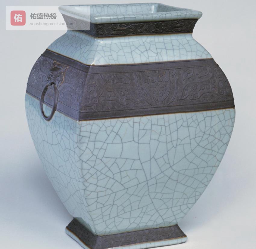 8.7 △ 仿哥釉古铜纹方尊仿哥釉开片如冰裂纹,通体以铜红料绘出回纹与兽面,方器圆耳,刚柔并济。