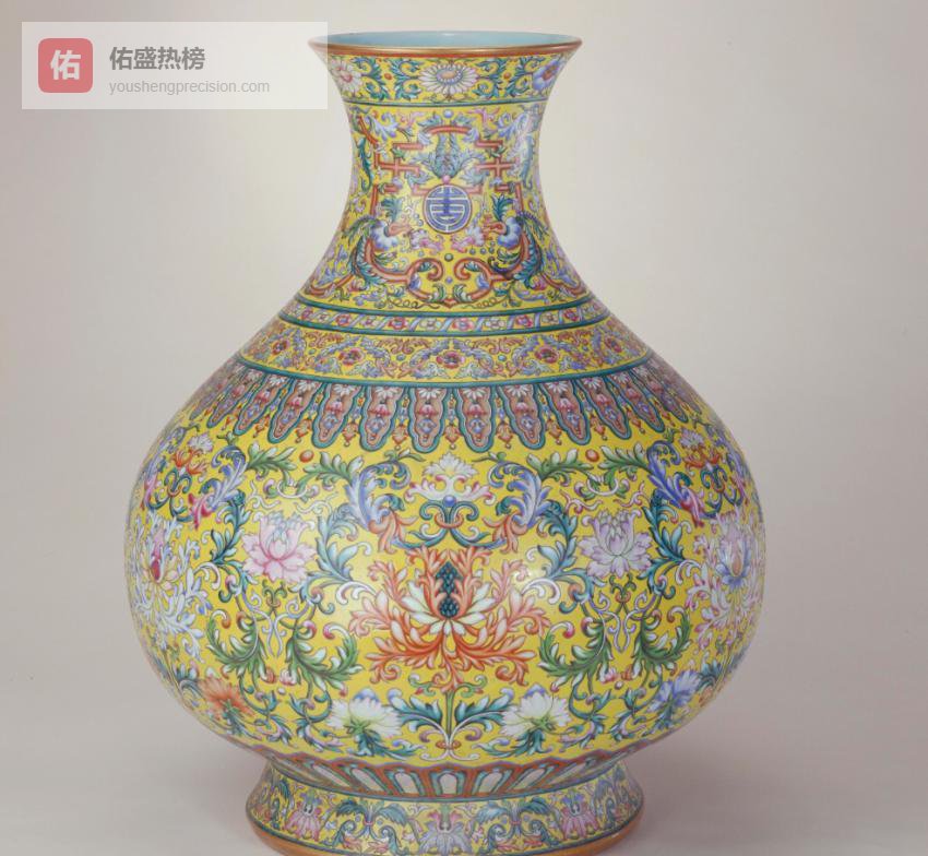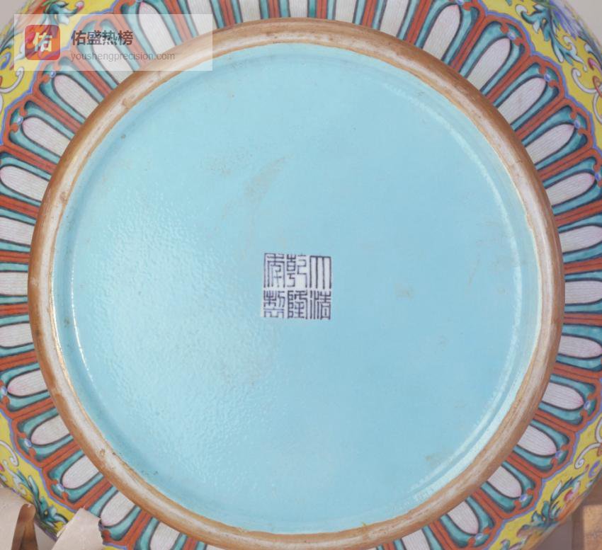 8.3 △ 黄地粉彩勾莲纹大尊通体黄粉彩为地,勾莲纹开光内绘吉祥图案,底书“大清乾隆年制”六字三行篆款,粉彩妍丽却不失庄重。