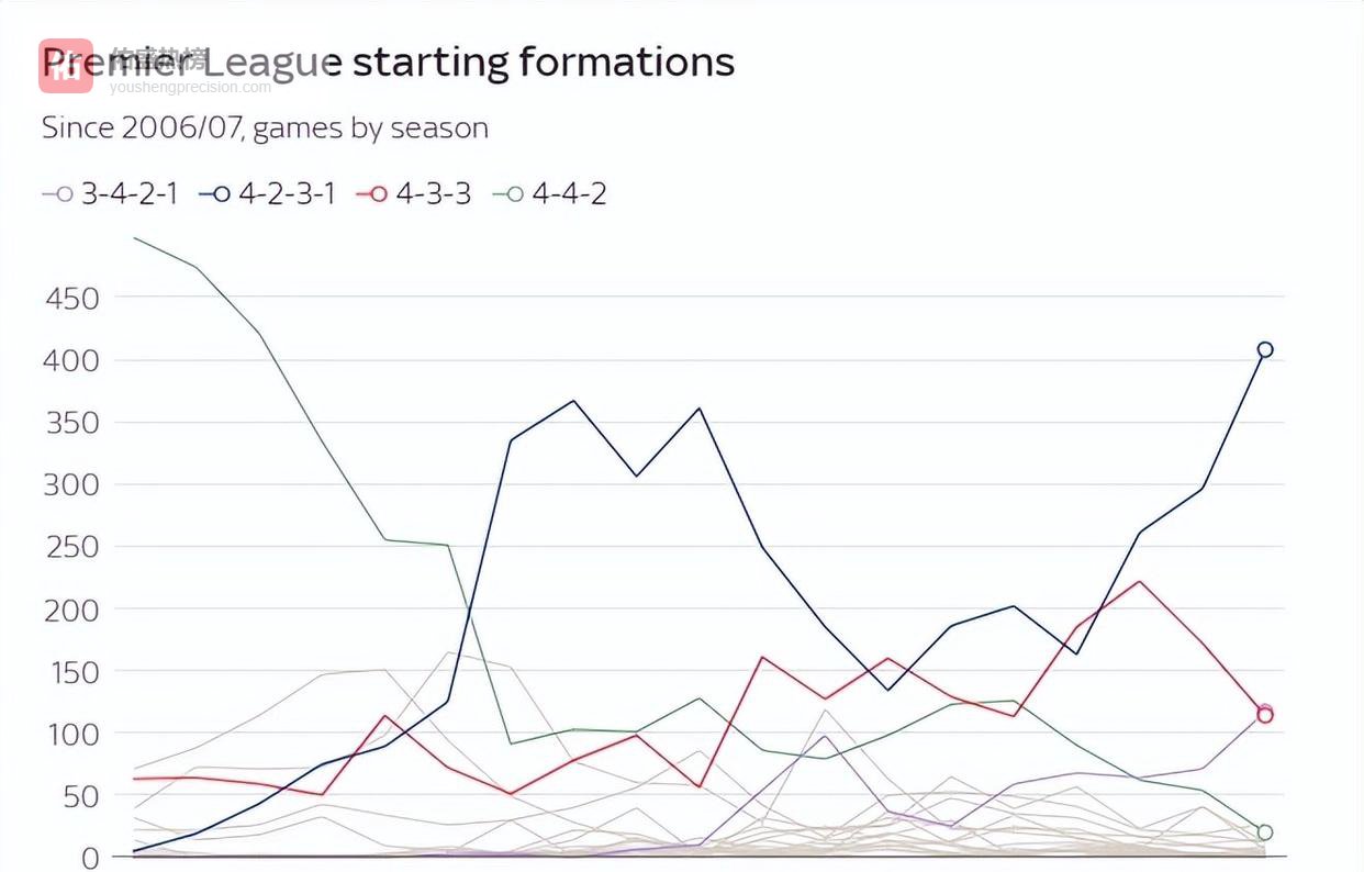 当下最火热的战术布局是4231阵型,而442阵型的热度明显大不如前,433阵型的使用频率一直在慢慢增加,不过最近两个赛季它也稍微有点降温了。