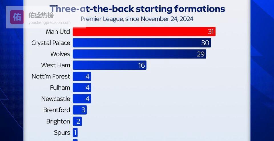 三后卫阵型在英超赛场上的风靡,阿莫林的执着运用功不可没。英超31场赛事中,他始终如一地采用三后卫打法,而同时期水晶宫和狼队也采用了这种战术体系。