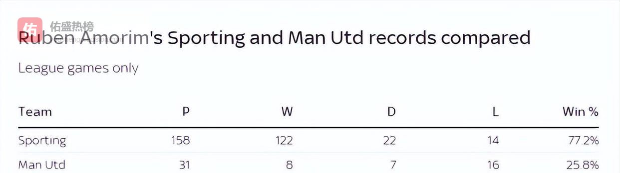 阿莫林执教葡萄牙体育时,联赛胜率达到77.2%,但到了曼联,胜率骤降至25.8%,在曼联历任主帅中排名最低。