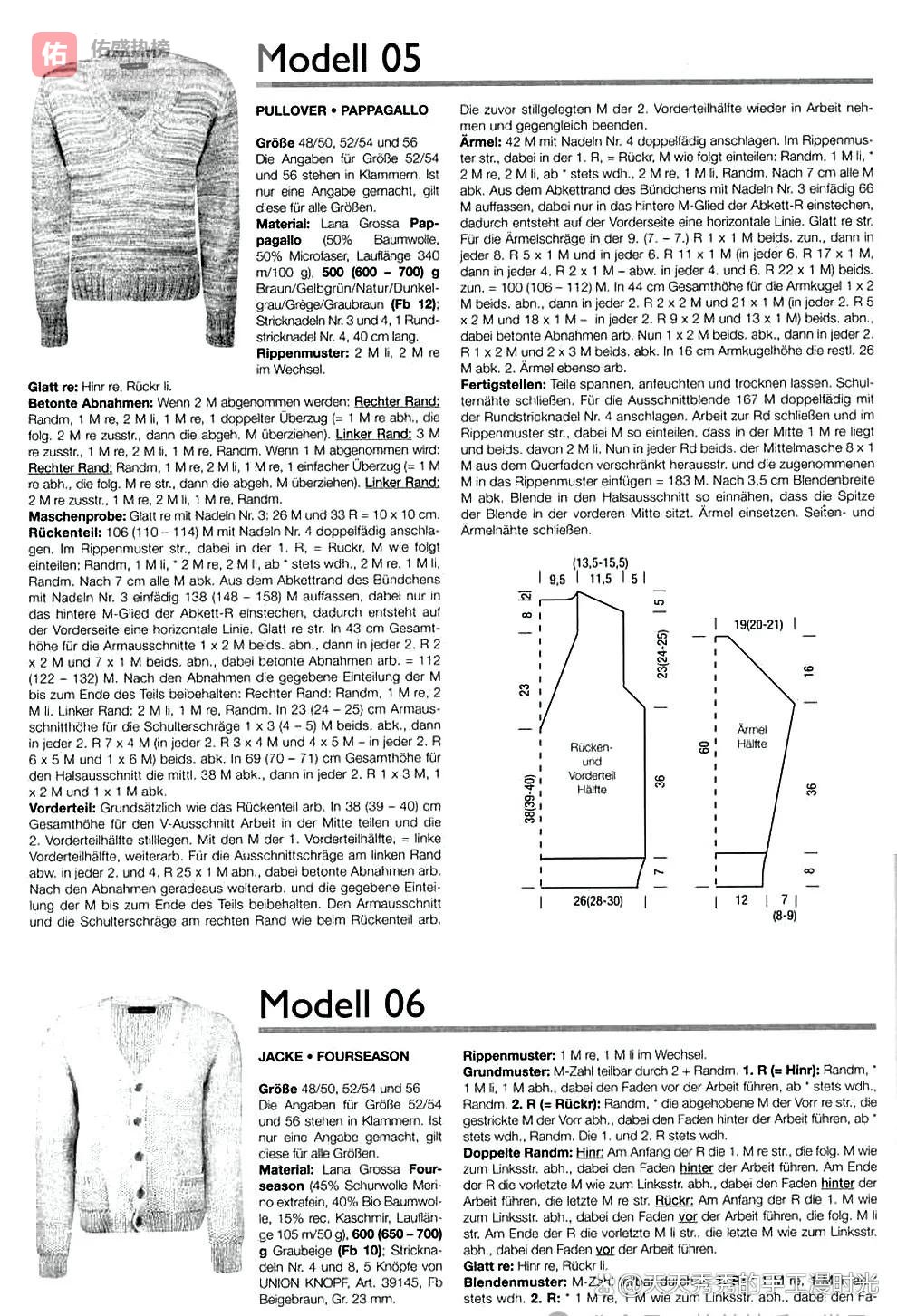 分享打动我的手工作品,希望能同样打动你,并给你带去手工的无限乐趣和无穷魅力。作品点评:这款手工棒针编织混色段染男士V领套头衫,是一款风格休闲随性、兼具质感与设计感的日常男士针织单品,适配48/50码、52/54码、56码三种男士常规尺码,可根据身形需求选择对应尺寸制作。作品选用拉娜格罗萨品牌鹦鹉系列段染线材,线材成分为50%棉、50%超细纤维,单团100克长度340米,这种棉与超细纤维的混纺材质,柔软亲肤,垂坠感好,不易起球,同时段染的线材自带自然的混色效果,由棕色、黄绿、自然色、深灰、米灰、灰棕多色合股加捻而成,线团中看似色彩杂乱,编织后却能形成自然的渐变混色肌理,在平针织物中呈现出绝佳的效果,避免了纯色织物的单调感。作品整体采用宽松的H型版型,V领的设计拉长颈部线条,不挑脸型,穿着舒适无束缚,对各种身形都有很好的包容度,既能作为日常休闲的单穿单品,也能作为外套内搭,适配周末出行、日常居家、轻通勤等多种场景。作品的设计细节丰富,下摆、袖口采用2针反2针正的双罗纹编织,边缘挺括不易变形;身片主体采用平针编织,最大程度展现段染线材的自然肌理,简约却不简单;V领边缘搭配罗纹领贴设计,领身采用双罗纹编织,同时在V领尖处做了收尖处理,让V领边缘更平整有型,久穿不卷边,领型自然立体。作品采用分片编织方式,分为后身片、左右前身片、袖子、领贴五大模块,先分别完成各织片的编织,再进行缝合组装,袖窿、V领、肩部采用规范的加减针收针设计,版型规整,穿着贴合身形不臃肿,线材的段染效果让每一件成品都独一无二,是一款兼具个性与实用性的男士针织单品。难度级别:三星方法说明:作品采用棒针分片编织技法,核心技法包括双股线别线锁针起针、双罗纹编织、平针编织、加针、减针、伏针收针、挑针圈织,以及织片的肩部缝合、侧缝缝合、上袖技法,全程使用棒针完成编织,配合缝针进行组装。图解来源网络,整理存解自用。材料准备、图解及方法说明:1. 材料准备(1)线材:拉娜格罗萨鹦鹉系列段染毛线,棕黄混色500克(52/54码600克,56码700克),单团100克,长度340米(2)工具:3号、4号棒针各1副,40厘米长4号环形棒针1根,缝合针1根,剪刀1把2. 成品尺寸适配尺码:48/50码、52/54码、56码,括号内为大码对应数据3. 编织密度使用3号棒针,10厘米×10厘米见方内,平针编织26针、33行4. 针法术语说明(1)双罗纹针:2针反针、2针正针交替编织(2)平针:正面行织正针,反面行织反针;圈织时全程织正针(3)双锁边针:正面行开头第1针织正针,最后1针织正针;反面行开头第1针滑针不织,最后1针滑针不织,中间针目按花样编织(4)显性减针:根据减针针数,2针或3针合并为1针,边缘减针规律清晰(5)伏针收针:平收针,用于织片边缘的收针5. 具体编织步骤(1)后身片编织① 起针:使用4号棒针、双股线,起106针(52/54码110针,56码114针)② 下摆罗纹:反面行开始,按双罗纹针规律编织,织至7厘米高度,平收所有针目③ 身片挑针:使用3号棒针、单股线,正面朝上,沿下摆罗纹的收针边缘,只挑收针的后半针,均匀挑138针(52/54码148针,56码158针)④ 主体平针编织:正面行开始,按双锁边针+平针的规律编织,织片总长度达到36厘米⑤ 袖窿减针:正面行开始,左右两侧各平收2针,之后每2行两侧各减2针2次,再每2行两侧各减1针7次,最终剩余112针(52/54码122针,56码132针)⑥ 斜肩与后领收针:袖窿织至23厘米(52/54码24厘米,56码25厘米)高度时,开始斜肩收针,左右两侧各平收3针(52/54码4针,56码5针)1次,之后每2行平收4针7次(52/54码平收4针3次、5针4次,56码平收5针6次、6针1次);同时在斜肩编织3厘米后,进行后领收针,中间平收38针,左右两侧各减3针1次、减2针1次、减1针1次,完成后身片编织,断线备用(2)前身片编织① 基础编织:下摆罗纹、身片挑针、主体平针编织、袖窿减针的基础规律,与后身片完全一致② V领收针:织片总长度达到38厘米(52/54码39厘米,56码40厘米)时,将织片从中间分开,左右两侧分别编织,按显性减针的规律,每2行和4行交替在领口边缘减1针25次,同步完成袖窿与斜肩收针,与后身片长度一致,左右前身片对称编织(3)袖子编织① 起针:使用4号棒针、双股线,起42针② 袖口罗纹:反面行开始,按双罗纹针规律编织,织至7厘米高度,平收所有针目③ 袖身挑针:使用3号棒针、单股线,正面朝上,沿袖口罗纹的收针边缘,只挑收针的后半针,均匀挑66针④ 袖身平针编织:正面行开始,按双锁边针+平针的规律编织⑤ 袖身加针:编织至第9行(52/54码7行,56码7行)时,左右两侧各加1针;之后每8行两侧各加1针5次,再每6行两侧各加1针11次(52/54码每6行加1针17次,56码每6行和4行交替加1针22次),最终总针数100针(52/54码106针,56码112针)⑥ 袖山减针:织片总长度达到44厘米时,开始袖山收针,左右两侧各平收2针,之后每2行两侧各减2针2次、减1针21次(52/54码18次,56码13次),再每2行两侧各减2针4次、减3针2次(52/54码减3针4次,56码减3针6次),最终剩余26针,平收断线,按相同方法编织另一只袖子(4)收尾与组装① 定型:将所有织片按尺寸平铺,喷水定型,自然晾干② 缝合:将左右前身片的斜肩与后身片的斜肩对齐,引拔缝合肩部;将前后身片的侧缝与袖子的袖底缝对齐,一次性缝合③ 领圈挑针:使用4号环形棒针、双股线,沿领圈边缘均匀挑167针,圈织双罗纹针,同时在V领尖处每圈做1次双针并针,共收尖8次,织至3.5厘米高度,按双罗纹规律平收所有针目④ 藏线:将所