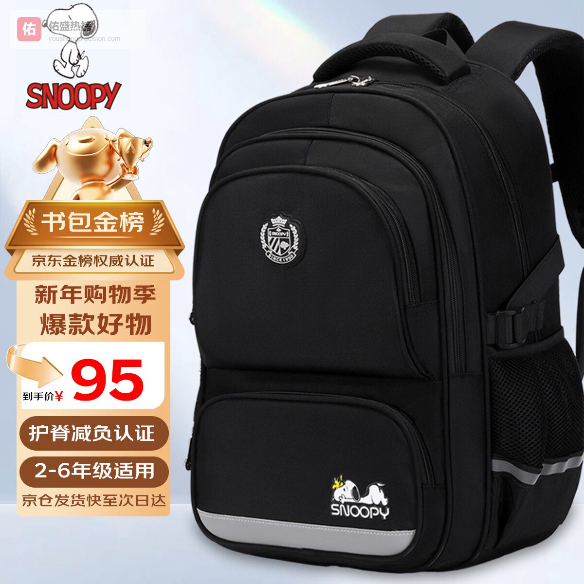 史努比(SNOOPY)小学生书包男孩学院风护脊减负1-4-6高年级儿童初中生双肩背包 黑¥