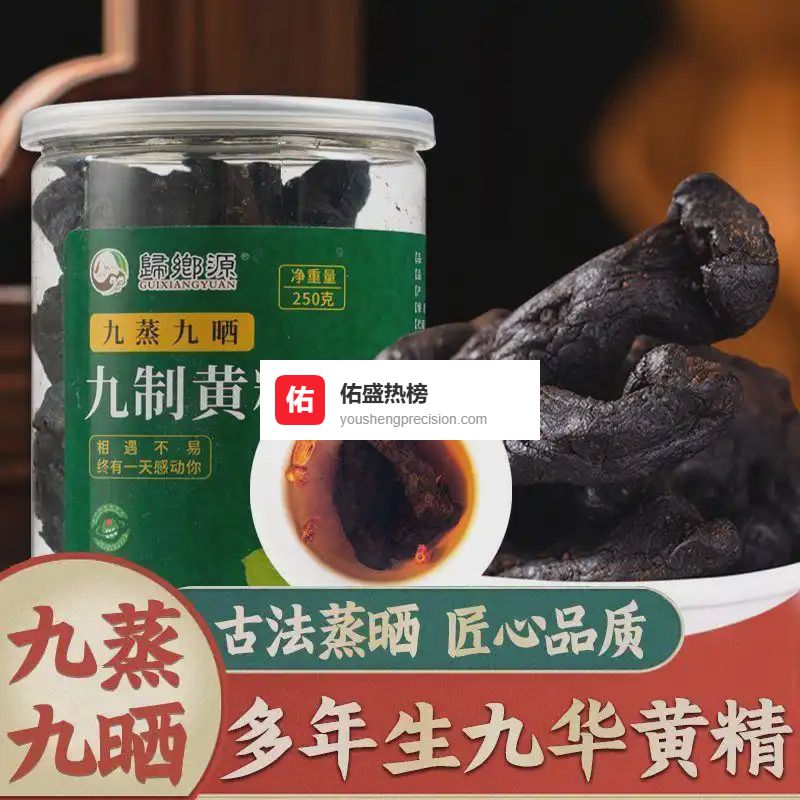 五、九制黄精:传统工艺的养生珍品☀️ 九晒九蒸古法工艺这款黄精采用传统"九晒九蒸"工艺精制而成,充分激发药材活性,使其更易被人体吸收。经过九次蒸晒的黄精,颜色乌黑发亮,口感软糯甘甜,可直接食用。