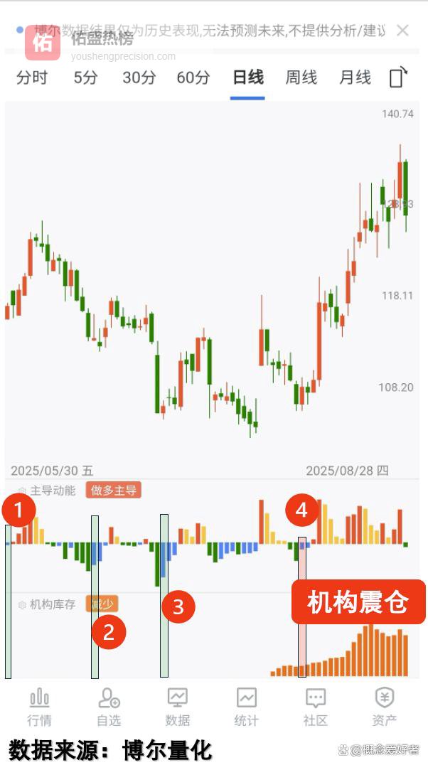 一、别被表面走势“晃花眼”阿凯之前踩过一个大坑,买了一只票,前三次反弹进去都被套,最少套半个多月才能解套,第四次反弹他彻底怕了,果断观望,结果眼睁睁看着票跳空涨起来,没两天又跌回去,他说那阵子连看盘的心情都没有。后来他接触了量化大数据,才明白问题出在哪——咱们平时看的走势图,根本没露出真实的交易意图。看图1,这就是那只票的交易行为数据图,和普通图不一样,它能帮咱们看到两个关键信息:一个是橙色的「机构库存」,代表机构大资金有没有积极参与交易;另一个是红黄蓝绿四种颜色的「主导动能」,对应不同的交易行为。前三次反弹的时候,根本看不到橙色的「机构库存」,说明都是散户在折腾,自然走不远;只有第四次,蓝色「回补」行为和橙色「机构库存」同时出现,这才是机构真的在参与,后续的走势也验证了这点。