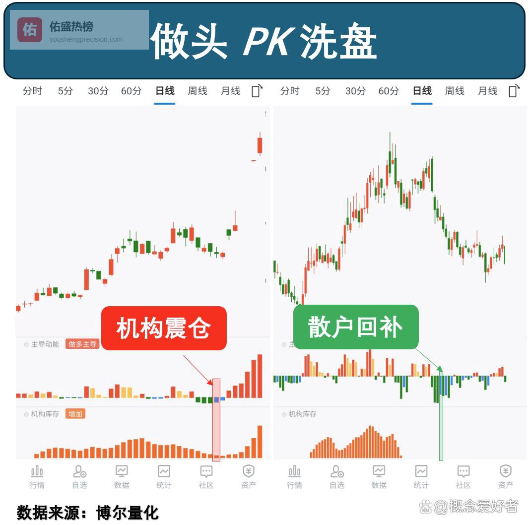 三、震荡行情里的“关键信号”但只要结合量化数据里的交易行为,这些纠结瞬间就解开了。看图4,左边的票在调整时,出现了「机构震仓」的信号——也就是机构先诱空,之后迅速回补,而且之前就有过一次类似的动作,说明是真的在调整蓄力,后面自然继续上涨;右边的票还是只有散户的「回补」行为,全程没看到橙色的「机构库存」,说明机构根本没参与,后续走势自然走弱。阿凯说,自从学会看这些数据,他再也不用对着走势图瞎猜,知道哪些是值得关注的信号,哪些是可以忽略的噪音。他还跟我感慨,以前总觉得市场是“黑箱”,现在用量化数据打开了一扇窗,才发现很多看似复杂的走势,背后都有清晰的规律。