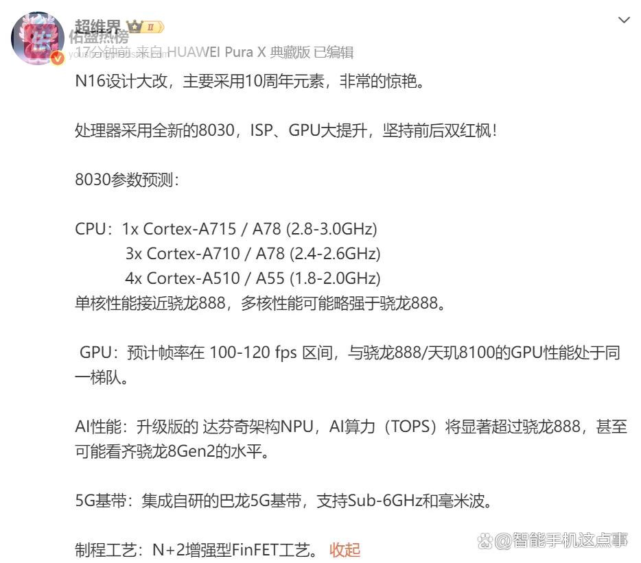 首先华为nova 16系列最核心的看点无疑是那颗全新的麒麟8030芯片,从博主爆料参数来看,其CPU采用“1+3+4”的八核心设计。