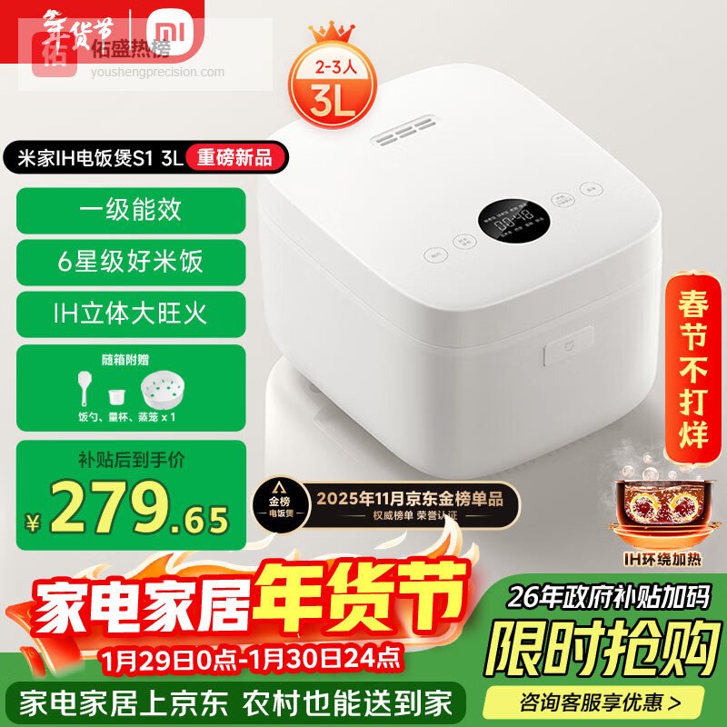 【京东自营】米家小米IH电饭煲S1家用2-3人多功能电饭锅不粘锅煮粥煮饭智能预约一级能效带蒸笼3升¥