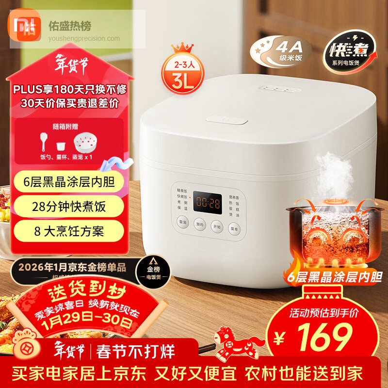 【京东自营】米家小米电饭煲家用2-3人多功能电饭锅煮粥锅煮饭不粘内胆智能预约N13升节能版【能效升级¥