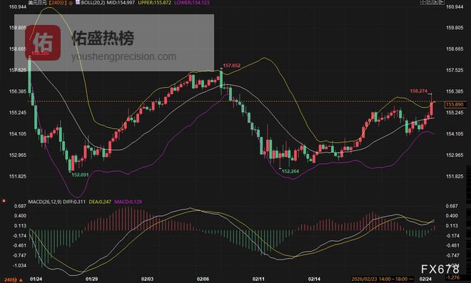 技术面:收敛形态下的临界点选择从240分钟K线图观察,美元兑日元自1月底以来构筑了清晰的箱体结构,上轨位于158.325,下轨在152.091,近期震荡区间进一步收窄至152.264—157.652之间。布林带(BOLL)指标显示,中轨当前位于154.998,上下轨分别延伸至155.877与154.120,带宽收敛意味着价格即将面临方向性选择。