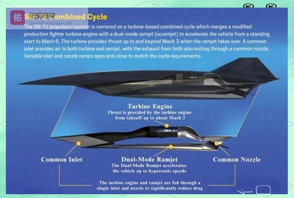 要在0~6马赫全程保持超音速,传统涡扇无法胜任,SR-72采用涡轮基组合循环(TBCC)方案: