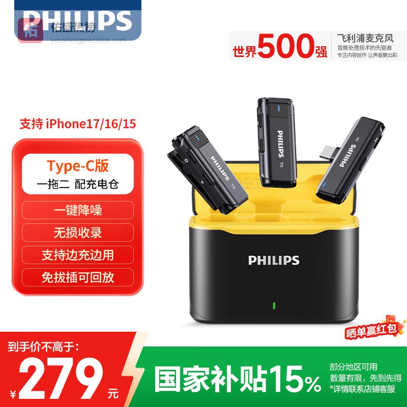 【京东自营】飞利浦【国家补贴】无线领夹麦克风一拖二收音麦主播直播户外vlog短视频直插式Type-C¥