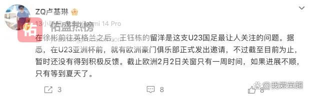 北京时间1月31日,来自知名媒体人、原《足球报》记者卢基琳透露,U23亚洲杯开赛前,有欧洲豪门俱乐部向王钰栋发出正式邀请,但目前还没有得到积极反馈。